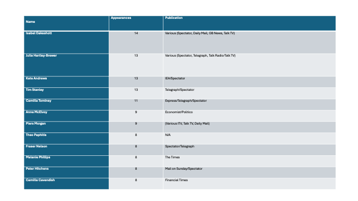 As I argue in the article, there is a tension between the public service remit of the BBC’s journalism and the need to produce an entertaining programme for the mass-market channel, BBC1. There is sometimes too much heat and too little light. But some of the best performers on the programme are journalists who are unafraid to express controversial opinions and argue their corner. It’s the reason why people such as Isabel Oakeshott and Julia Hartley Brewer are so often booked. But the table demonstrating the frequency of some appearances should raise questions about whether the BBC is relying on too small a group of pundits: